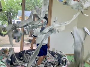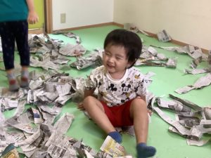 両手で千切ったり、丸めたり、被ったりして遊んでいます^^