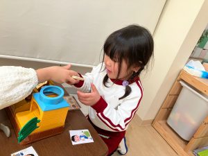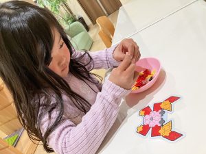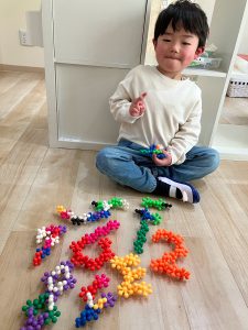 先生と一緒にブロックでいろんな数字を作って並べたよ