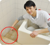 続いてはお風呂の工夫です。元気の家ではリハビリもかねて、機械浴ではなくあえて普通の浴槽を使用しています(機械浴の設備もあります)。この浴槽にも様々な工夫が施されているので、要介護度が高い方でも安全かつ自力で利用できるようになっています。利用者様が自力で動いてくださる工夫が、スタッフにとっては何よりの腰痛対策ですからね。